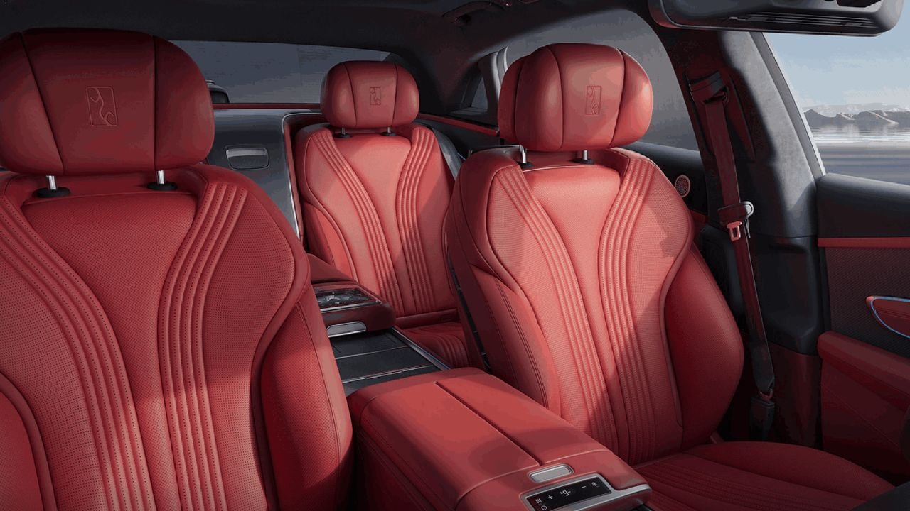 With a long wheelbase, the Yangwang U7 offers a spacious and luxurious interior with nappa leather and three large touch screens. The seats have ventilation, heating, and massaging functions along with a 20-point power adjustment. The rear passengers have foldout tables and a mini refrigerator along with two touch screens.
