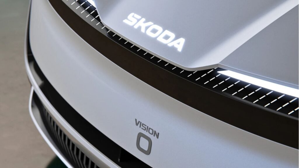 The rear feature T-shaped taillights, a split spoiler, illuminated SKODA lettering and the Vision O logo towards the bumper.